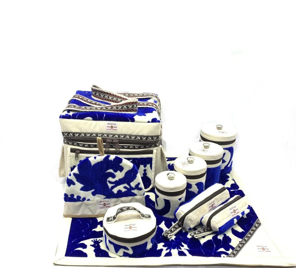 بكج طقم شنطه ابو طير ازرق مع قماش ابيض مطرز